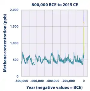 The globally averaged concentration of methane in Earth's atmosphere increased by about 150% from 722 ± 25 ppb in 1750 to 1803.2 ± 1.2 ppb in 2011.[22] As of 2011, methane contributed radiative forcing of 0.48 ± 0.05 Wm−2,[23] or about 17% of the total radiative forcing from all of the long-lived and globally mixed greenhouse gases. According to NOAA, the atmospheric methane concentration has continued to increase since 2011 to an average global concentration of 1892.2 ppb as of December 2020.[24] The March 2019 peak was 1866.2 ppb, while the April 2020 peak was 1876.0 ppb, a .5% increase.[24]