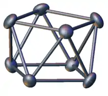 Zintl compounds feature naked anionic clusters that are generated by reduction of heavy main group p elements, mostly metals or semimetals, with alkali metals, often as a solution in anhydrous liquid ammonia or ethylenediamine.[9] Examples of Zintl anions are [Bi3]3−, [Sn9]4−, [Pb9]4−, and [Sb7]3−.[10] Although these species are called "naked clusters", they are usually strongly associated with alkali metal cations. Some examples have been isolated using cryptate complexes of the alkali metal cation, e.g., [Pb10]2− anion, which features a capped square antiprismatic shape.[11] According to Wade's rules (2n+2) the number of cluster electrons is 22 and therefore a closo cluster. The compound is prepared from oxidation of K4Pb9 [12] by Au+ in PPh3AuCl (by reaction of tetrachloroauric acid and triphenylphosphine) in ethylene diamine with 2.2.2-crypt. This type of cluster was already known as is the endohedral [Ni@Pb10]2− (the cage contains one nickel atom). The icosahedral tin cluster [Sn12]2− or stannaspherene anion is another closed shell structure observed (but not isolated) with photoelectron spectroscopy.[13][14] With an internal diameter of 6.1 Ångstrom, it is of comparable size to fullerene and should be capable of containing small atoms in the same manner as endohedral fullerenes, and indeed exists a Sn12 cluster that contains an Ir atom: [Ir@Sn12]3−.[15]