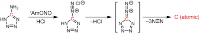Atomic carbon is generated in the thermolysis of 5-diazotetrazole upon extrusion of 3 equivalents of dinitrogen:[3]