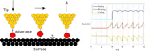 Lateral manipulation means moving an adsorbate on the surface by making a temporary chemical or physical bond between the STM tip and the adsorbate. A typical lateral manipulation sequence begins by positioning the tip close to the adsorbate, bringing the tip close to the surface by increasing the tunneling current setpoint, moving the tip along a desired route and finally retracting the tip to normal scanning height. Lateral manipulation is typically applied to strongly bound adsorbates, such as metal adatoms on metal surfaces. The probability that the surface adsorbate moves the same distance traveled by the tip is strongly dependent on the tip conditions.