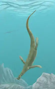 | Life restoration in a swimming posture, with Dinocephalosaurus in the background | |