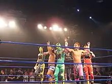 In March 2009, Kotoge entered the Indie Junior Challenger Determination tournament, defeating tag team partner Daisuke Harada in his first round match.[15] The finals of the tournament on April 4 was a three-way match between stablemates Kotoge, Harada and Tadasuke, with Harada once again being victorious.[15] On June 6, 2009, Tadasuke, considered the lowest ranking member of Blood & Guts, turned on the stable and joined rival group LOV (Legion of Violence).[16] The turn built to a Hair vs. Hair match on July 25, where Kotoge was defeated by Tadasuke.[17] With Zeus out of Osaka Pro, Kotoge and Harada disbanded the Blood & Guts stable, renamed their tag team Momo no Seishun Tag and concentrated on chasing the Osaka Pro Wrestling Tag Team Championship. On January 16, 2010, Kotoge and Harada defeated Orochi and Tadasuke to become the number one contenders to the Osaka Pro Wrestling Tag Team Championship and finally, on February 11, defeated Hideyoshi and Masamune to win the Tag Team Championship for the first time.[9][12][18][19] On May 9, Kotoge and Harada teamed with Takoyakida to defeat Tokyo Gurentai (Fujita, Mazada and Nosawa Rongai) for the UWA World Trios Championship.[12][18][20] They would hold the Trios Championship for a month, before losing it to Ebessan, Kanjyouro Matsuyama and Kuishinbo Kamen.[18][20][21] On July 17, Momo no Seishun Tag lost the Osaka Pro Wrestling Tag Team Championship to Don Fujii and Masaaki Mochizuki, representing rival promotion Dragon Gate.[18][19]
