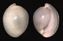 - Description : found at depths up to 183 m; small ovate white shell, narrowing toward the apex; sunken spire; body whorl has spiral grooves at the edges; narrow aperture