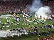 The Auburn University Marching Band (AUMB) is the marching band of Auburn University and the 2004 recipient of the Sudler Intercollegiate Marching Band Trophy.[1] With 380 members, the band traces its origins to 1897 when M. Thomas Fullan proposed to then-president Dr. William Broun that the drum corps accompanying cadet drills be replaced with a full instrumental band.