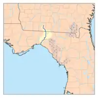 The Aucilla River rises in Brooks County, Georgia, USA, close to Thomasville, and passes through the Big Bend region of Florida, emptying into the Gulf of Mexico at Apalachee Bay. Some early maps called it the Ocilla River. It is 89 miles (143 km) long and has a drainage basin of 747 square miles (1,930 km2). Tributaries include the Little Aucilla and Wacissa Rivers. In Florida, the Aucilla River forms the eastern border of Jefferson County, separating it from Madison County on the northern part, and from Taylor County to the south.[1][2]