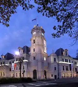 The main gallery building was originally designed by Melbourne architects Grainger & D'Ebro to house not only the art gallery but also the City Council offices, lecture theatre and public library. It is constructed of brick and plaster in an early French Renaissance style and was completed in 1887, with an extension built in 1916.[4] It is three storeys high, with an attic in the steep pitched roofs, and a six-storey clock tower. The building was registered as a Category I heritage item by Heritage New Zealand on 24 November 1983, listed with registration number 92.[5]