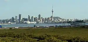 The Northern Motorway skirting the edge of the Waitematā Harbour on the northern approach to the Auckland Harbour Bridge. Central Auckland can be seen across the harbour.