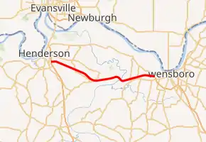 | Henderson | Henderson | 0.000 | 0.000 | 0 | Western terminus and signed as exits 0A (north) and 0B (south); I-69 exit 149 | |