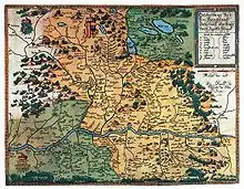 Hirschvogel took up etching late in his career, and almost all of his prints date from the last decade of his life, when he resided in Vienna. His etchings, numbering about 300, "reflect his concern with Italianate problems of space, form, and ornament",[3] and include portraiture, cartography, and book ornamentation. He was among the first etchers to use copper rather than iron plates. He contributed 23 etchings to Sigismund von Herberstein's 1549 edition of Rerum Moscoviticarum Commentarii (Notes on Muscovite Affairs), and more than 100 Old and New Testament illustrations for the verses of Hungarian reformer Péter Perényi (1502–48). A series of 53 hunting scenes for stained glass are of questionable authorship, but Peters asserts that they are by Hirschvogel. Hirschvogel is credited with the single authentic portrait of the Swiss physician Paracelsus, but this attribution is not certain.[4]