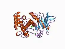 Aureolysin (EC 3.4.24.29, protease III, staphylococcal metalloprotease, Staphylococcus aureus neutral proteinase) is an extracellular metalloprotease expressed by Staphylococcus aureus.[1][2][3][4][5] This protease is a major contributor to the bacterium's virulence, or ability to cause disease, by cleaving host factors of the innate immune system as well as regulating S. aureus secreted toxins and cell wall proteins.[6][7] To catalyze its enzymatic activities, aureolysin requires zinc and calcium which it obtains from the extracellular environment within the host.[6][7]