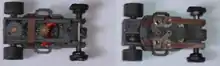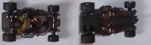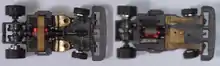 | 1976 | G-Plus | Innovative in-line motor design that increased speed as well as magnetic exposure to the track rails. This chassis allowed for detailed open wheel Formula 1 style car bodies in its narrow version. | |