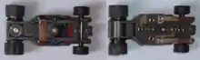 The Aurora Plastics Corporation introduced the A/FX (Aurora Factory Experimentals, later simply "AFX") line of slot cars, slot car track sets, and related accessories in 1971. The AFX brand continued production until the company was forced into receivership in 1983.[1] Aurora designed the AFX cars with interchangeable car body shells usually compatible with each chassis they released during these years. The original 1971 A/FX chassis utilized an updated version of the existing pancake motor design of Aurora's "Thunderjet 500" line, popular in the 1960s.[2] Aurora then released a longer version of the A/FX chassis in 1973, known as the "Specialty" chassis, which incorporated a longer wheelbase and gearplate (and often a more powerful armature) with bodies unique to that chassis. The car bodies designed to fit the shorter original chassis featured a clever snap-on design while the bodies for the Specialty chassis were affixed with a small screw. In 1974, Aurora redesigned both the original and Specialty chassis and exposed the bottom of the motor magnets. The exposed magnets were attracted to the metal rails in the track during racing, creating downforce to help hold the car on the track while cornering. AFX "Magna-Traction" cars remained popular from their release in 1974 throughout 1983, even after faster chassis designs were introduced in house and by Tyco.