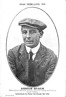 Stack was arrested and sentenced to death for his involvement in the Rising; however, this was later commuted to penal servitude for life. He was released under general amnesty in June 1917 and was elected as an abstentionist Sinn Féin MP for Kerry West at the 1918 Westminster election, becoming a member of the 1st Dáil. He was elected unopposed as an abstentionist member of the House of Commons of Southern Ireland and a member of the 2nd Dáil as a Sinn Féin TD for Kerry–Limerick West at the 1921 elections.[5]