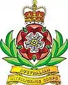 The AUSTINT badge was modelled on the British Army Intelligence Corps badge and accepted in 1953.[4] It has the motif of a white and red Tudor rose which is flanked by laurel leaves and rests on a scroll inscribed with "Australian Intelligence Corps". A crown surmounts the whole motif. The Rose symbolises security, confidentiality and trustworthiness, derived from the Cromwellian use of a rose displayed to indicate when secret matters were being discussed. The laurel wreath depicts honour and the crown represents allegiance to the Sovereign.