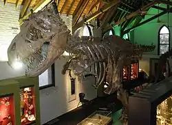 The main attraction for tourists and enthusiasts is the 10½ metre long and 4-metre high Tyrannosaurus rex (T.Rex) skeleton.[3] In addition, the Museum houses Australia's largest collection of fossils in amber, fossil dinosaur eggs, and a large collection of opalised fossils.
