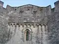 [16] The Church of Notre-Dame is a fortified church with a curtain wall, a walkway, slots, a bell tower, and a gatehouse. Its construction was carried out in two stages: first in the 12th century then in the 15th century when it was fortified. The facade has two serrated platforms on its angled buttresses connected by a passageway with cruciform notches for archers. The Chevet also has a crenellated roof.[17] The church also has murals from the 19th century.