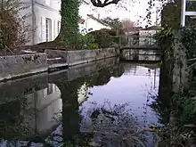 [14] The chateau is moated with the moat fed by the Dandelot. It is a construction from the 16th century which was largely redesigned in the following centuries. The guard tower and the front door of the castle date back to 1580 and the angled wing with mullioned windows dates to 1606. - The Chateau Park.