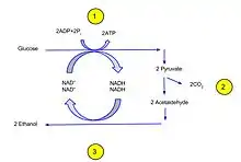 Fermentation is a biochemical process during which yeast and certain bacteria convert sugars to ethanol, carbon dioxide, as well as other metabolic byproducts.[11][12] The fermentation pathway involves pyruvate formed from yeast in the EMP pathway, while some bacteria obtain pyruvate through the ED pathway.[11] Pyruvate is then decarboxylated to acetaldehyde in a reaction involving the enzyme pyruvate decarboxylase.[11] Reduction of acetaldehyde to ethanol produces NAD+, which is catalyzed by alcohol dehydrogenase (ADH).[11] ADH rids the body of alcohol through a process called first pass metabolism.[7] However, if the rate of ethanol breakdown is less than the rate of production, intoxication ensues.