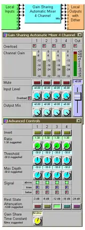 Dan Dugan showed his first "Adaptive Threshold Automatic Microphone Mixing System" in 1974 at the 49th Audio Engineering Society (AES) meeting in New York,[13] and was granted a patent for a control apparatus for sound reinforcement systems which sensed ambient sound level in the environment of a theater to control each microphone's individual level.[14] In 1976, Dugan was granted a patent for an automatic microphone mixing process whereby the total gain of the system remains constant.[15] He began manufacturing his first automixer system, the Model A, based on his two patents. Dugan built 60 units, with the first, hand-assembled one taken to Bell Labs to be installed in their conference room for Harvey Fletcher.[16] The algorithm was simple and effective: Each individual input channel is attenuated by an amount, in dB, equal to the difference, in dB, between that channel's level and the sum of all channel levels.[17] Dugan licensed the system to Altec which released several automixer models including the 1674A, -B and -C series and the 1684A, all focusing on speech applications.[18][19] (The 1684A became an Electrovoice product and is currently administered by their Commercial division.[20]) The earliest Altec product implementation was regarded as inferior within the commercial audio contractor industry,[1] and other manufacturers began to design their own automixer products.