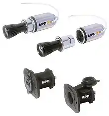 An automobile auxiliary power outlet (also known as car cigarette lighter or auxiliary power outlet[1]) in an automobile was initially designed to power an electrically heated cigarette lighter,[1] but became a de facto standard DC connector to supply electrical power for portable accessories used in or near an automobile directly from the vehicle's electrical system. Such include mobile phone chargers, cooling fans, portable fridges, electric air pumps, and power inverters.[1]