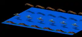 The following autostereogram shows three rows of repeated patterns. Each pattern is repeated at a different interval to place it on a different depth plane. The two non-repeating lines can be used to verify correct wall-eyed viewing. When the autostereogram is correctly interpreted by the brain using wall-eyed viewing, and one stares at the dolphin in the middle of the visual field, the brain should see two sets of flickering lines, as a result of binocular rivalry.[11]
