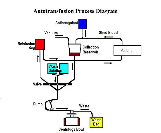 Autotransfusion is a process wherein a person receives their own blood for a transfusion, instead of banked allogenic (separate-donor) blood. There are two main kinds of autotransfusion: Blood can be autologously "pre-donated" (termed so despite "donation" not typically referring to giving to one's self) before a surgery, or alternatively, it can be collected during and after the surgery using an intraoperative blood salvage device (such as a Cell Saver, HemoClear or CATS). The latter form of autotransfusion is utilized in surgeries where there is expected a large volume blood loss – e.g. aneurysm, total joint replacement, and spinal surgeries. The effectiveness, safety, and cost-savings of intraoperative cell salvage in people who are undergoing thoracic or abdominal surgery following trauma is not known.[1]