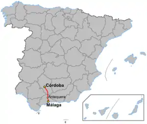 The Autovía A-45[1] (also known as Autovía de Málaga) is an autovía in Andalusia, Spain, running from the Autovía A-4 at Córdoba to the Autovía A-7 at Málaga. It replaced much of the former N-331 road.