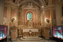 On the walls, below the cornice, are two paintings by Achille Iovine showing the Holy Family, to the left, and Saint Lawrence the Martyr to the right; there are in addition four niches containing gesso statues of the Four Evangelists. Above the cornice are five paintings by Angelo Michele Ricciardi of saints: Saint Francis Xavier, Saint Charles Borromeo, Saint Andrea Avellino, Saint Modestinus and Saint Gaetano Thiene.