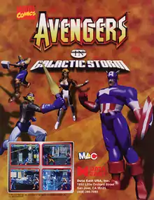 Avengers in Galactic Storm (アベンジャーズ・イン・ギャラクティックストーム) is a 1995 fighting arcade game developed and published by Data East. It features a single or two-player story mode or multiplayer head-to-head mode, and was the first modern fighting game to feature assistant characters commonly referred to by gamers either as "helpers" or "strikers". The game is based on characters in the Marvel universe, primarily The Avengers but also the Kree. The game's plot and roster of playable characters is based on the Operation: Galactic Storm story arc. Before their bankruptcy in 2003, it was one of Data East's last fighting games, as well as their third and last game based on The Avengers after their two 1991 video games: the Captain America and The Avengers beat 'em up arcade and the NES platform game of the same name.