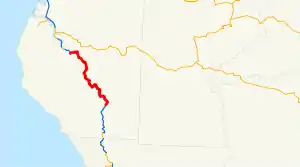 Except where prefixed with a letter, postmiles were measured on the road as it was in 1964, based on the alignment that existed at the time, and do not necessarily reflect current mileage. R reflects a realignment in the route since then, M indicates a second realignment, L refers to an overlap due to a correction or change, and T indicates postmiles classified as temporary ().[1] Segments that remain unconstructed or have been relinquished to local control may be omitted. The entire route is in Humboldt County.