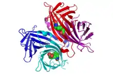 Avidin is a tetrameric biotin-binding protein produced in the oviducts of birds, reptiles and amphibians and deposited in the whites of their eggs. Dimeric members of the avidin family are also found in some bacteria.[1] In chicken egg white, avidin makes up approximately 0.05% of total protein (approximately 1800 μg per egg). The tetrameric protein contains four identical subunits (homotetramer), each of which can bind to biotin (Vitamin B7, vitamin H) with a high degree of affinity and specificity. The dissociation constant of the avidin-biotin complex is measured to be KD ≈ 10−15 M, making it one of the strongest known non-covalent bonds.[2]