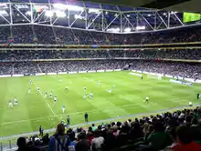 Aviva Stadium (also known as Lansdowne Road or Ireland's stadium; Irish: Staid Aviva)[9] is a sports stadium located in Dublin, Ireland, with a capacity for 51,700 spectators (all seated).[10][11] It is built on the site of the former Lansdowne Road Stadium, which was demolished in 2007, and replacing it as home to its chief tenants: the Irish rugby union team and the Republic of Ireland football team. The decision to redevelop the stadium came after plans for both Stadium Ireland and Eircom Park fell through. Aviva Group Ireland signed a 10-year deal for the naming rights in 2009.[12]