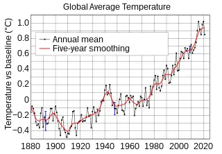 In 2005, an international conference titled Avoiding Dangerous Climate Change: A Scientific Symposium on Stabilisation of Greenhouse Gases examined the link between atmospheric greenhouse gas concentration and global warming and its effects. The conference name was derived from Article 2 of the charter for the United Nations Framework Convention on Climate Change[1] The conference explored the possible impacts at different levels of greenhouse gas emissions and how the climate might be stabilized at a desired level. The conference took place under the United Kingdom's presidency of the G8, with the participation of around 200 "internationally renowned" scientists from 30 countries. It was chaired by Dennis Tirpak and hosted by the Hadley Centre for Climate Prediction and Research in Exeter, from 1 February to 3 February.[2] The conference was one of many meetings leading up to the 2015 Paris Agreement, at which the international community agreed to limit global warming to no more than 2 ºC in order to have a 50-50 chance of avoiding dangerous climate change. However, a 2018 published study points at a threshold at which temperatures could rise to 4 or 5 degrees through self-reinforcing feedbacks in the climate system, suggesting the threshold (or 'tipping point') is below the 2 degree temperature target.[3]