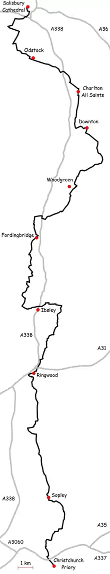 The path takes its name from the River Avon. From Salisbury it passes through the towns of Fordingbridge and Ringwood as well as the villages of Odstock, Nunton, Charlton-All-Saints, Downton, Hale, Woodgreen, Turmer, Ibsley, Kingston, Sopley and Burton. It ends near the coast at Christchurch Priory, Dorset.[1]