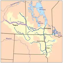 ![]() The Red River drainage basin, with the Qu'Appelle River highlighted | |