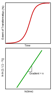 which allows the determination of the constants n and k from a plot of vs . If the transformation follows the Avrami equation, this yields a straight line with slope n and intercept .