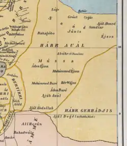 After the death of Sultan Hersi Aman, the Baha Diiriye and Baha Makahil sections of the Sugulle dynasty vied for the Sultanship, which divided the Habr Yunis clan into two factions, one faction led by Guled Haji crowned Awad of the Baha Diiriye and the other Nur Ahmed Aman.[2][3] The two Sultans engaged in a lengthy war and divided the Sultanate's territory, where Awad ruled the Sultanate from his chosen capital of Burao.[4] Frank Linsly James visited Sultan Awad at Burao in 1884 and witnessed the dissenting situation between the two Sultans. Describing the political situation in the region, he writes: