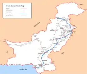 Awam Express (Urdu: عوام ایکسپریس) is a passenger train operated daily by Pakistan Railways between Karachi and Peshawar. It is one of the longest continuous running passenger trains in Pakistan.[1] The trip takes approximately 33 hours and 30 minutes to cover a published distance of 1,721 kilometres (1,069 mi), traveling along the entire stretch of the Karachi–Peshawar Railway Line.