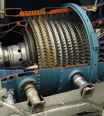 An axial compressor is a gas compressor that can continuously pressurize gases. It is a rotating, airfoil-based compressor in which the gas or working fluid principally flows parallel to the axis of rotation, or axially. This differs from other rotating compressors such as centrifugal compressor, axi-centrifugal compressors and mixed-flow compressors where the fluid flow will include a "radial component" through the compressor. The energy level of the fluid increases as it flows through the compressor due to the action of the rotor blades which exert a torque on the fluid. The stationary blades slow the fluid, converting the circumferential component of flow into pressure. Compressors are typically driven by an electric motor or a steam or a gas turbine.[1]
