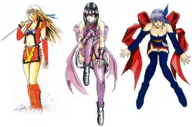 Ayane's appearance of a "sweet girl" is misleading and hides her "devious nature".[17] She wears a variety of mostly purple and black female ninja suits and other attires (including a schoolgirl uniform[35] and a Carnival of Venice-style costume[36]), often coming with a miniskirt or tunic and often featuring a butterfly motif (later even on her weapons[37]). Among about 20 Ayane's outfits in the 2004 compilation game Dead or Alive Ultimate,[38] one was inspired by the character Millennia from Kagero: Deception 2.[38][39] One of her alternative costumes in Ninja Gaiden Sigma 2 also pays homage to Sun Shangxiang (Lady Sun) from Koei's Dynasty Warriors series.[40] Her other wardrobe in Last Round includes outfits designed by Tamiki Wakaki, a destructible green dress in 2014[41][42] and a purple armor in 2016,[43] as well as downloadable costumes based on the Clockwork Princess Millennia from Tecmo Koei's Deception IV: The Nightmare Princess,[44] Fie Claussell from Nihon Falcom's The Legend of Heroes: Trails of Cold Steel II,[45] Satoka Sumihara from Square Enix's School Girl Strikers,[46] Cocona from Tatsunoko's Nurse Witch Komugi,[47] Nene from Samurai Warriors,[48] and Yukino Aguria from Fairy Tail,[49] among others. Her default costume in Dead or Alive 6 is to feature an Assassin's Creed style hood, described as "a cool new look but keeping things as punk and pink as ever."[50]