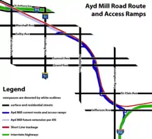 Ayd Mill Road is a road in Saint Paul, Minnesota. It runs diagonally through Saint Paul, connecting with Interstate 35E at its southeast terminus, and feeds into Selby Avenue at its northwest end. Indirect access to I-94 is possible via Selby and Snelling Avenues. Originally known as the Short Line Road, it was renamed in 1987 for John Ayd, a German settler who maintained a mill and residence in the area in the mid-to-late 19th century.[1]