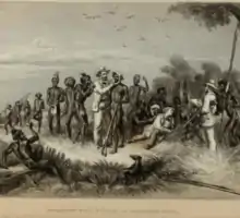 In 1843, during the surveying voyage of HMS Fly, Lieutenant John Ince, Joseph Jukes and Frederick Evans sailed up the river near to where the town of Ayr is now located. They encountered two large tribes of Aboriginal people with whom they had friendly interactions, exchanging items and participating in an apparent Welcome to Country ceremony. Artist, Harden Sidney Melville was also present, later drawing a depiction of the meeting.[10]