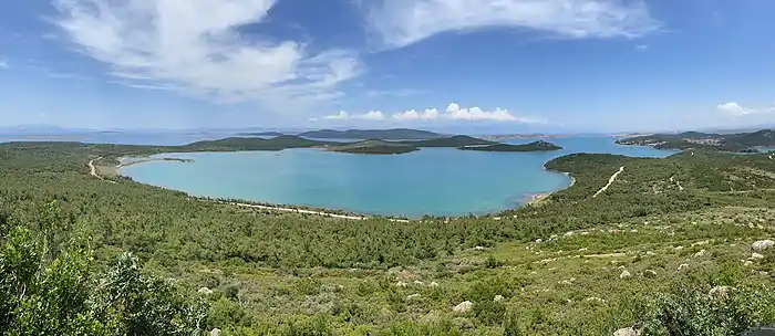 Ayvalık is a district in Turkey's Balıkesir Province on the Aegean Sea's Edremit Gulf and Dikili Gulf. Its center is situated on a narrow coastal plain surrounded by low hills to the east which are covered with pine and olive trees. Ayvalık is also surrounded by the archipelago of the Ayvalık Islands (the largest of which is Cunda Island) in the west, and by a narrow peninsula in the south named the Hakkıbey Peninsula. Altınova and Küçükköy are other southern neighborhoods of Ayvalik, which are away from the town center. Altınova and Küçükköy's Sarımsaklı have long pristine beaches on their shores. Ayvalık is the southernmost district of Balıkesir and the Edremit Gulf. Gömeç, Burhaniye and Edremit are other districts of the Balıkesir Province which are situated on the Aegean Sea's Edremit Gulf, and they are lined up respectively to the north. Dikili district of Izmir Province is to the south of Ayvalık, and also it encompasses the remaining southern part of the Dikili Gulf. Ancient Bergama district of Izmir is to the east of Ayvalık. The Greek island of Lesbos is further west of Ayvalık. The region is under the influence of a typical Mediterranean climate with mild and rainy winters and hot, dry summers.