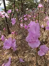 Sobaeksan, one of the 12 well-known Sobaek Mountains, lying on the border between Chungbuk Province and Gyeongbuk has a royal azalea (Rhododendron schlippenbachii) festival held on May every year. Sobaeksan has an azalea colony dotted around Biro mountaintop, Gukmang and Yonwha early in May. When royal azaleas have turned pink in the end of May, it looks like Sobaeksan wears a pink Jeogori (Korean traditional jacket).[9]