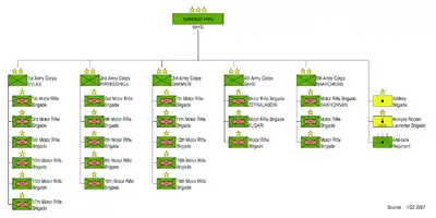 The IISS estimated in 2007 that the Azerbaijani regular army was 56,840 strong, probably basing this figure on Conventional Forces in Europe treaty data. It attributes to the army five corps headquarters, 23 motor rifle brigades, one artillery brigade, one multiple rocket launcher brigade, and one anti-tank regiment.[20] Of the five army corps, the 1st, 2nd, and 3rd Army Corps are concentrated against NK; part of 2nd is deployed on the Azerbaijan-Iranian border; the 4th covers the capital and the coast and the 5th is deployed exclusively in Nakhchivan.[21][22] Following the 2020 war, and specifically during the Baku Victory Parade, experts noted that a 6th corps was created, in part due to the partial mobilization that occurred in the country during that 44-day period.[23][24]