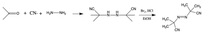 AIBN is produced from acetone cyanohydrin and hydrazine, then followed by oxidation:[4]