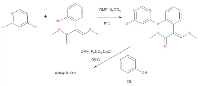 The first synthesis of azoxystrobin was disclosed in patents filed by the ICI group.[14] The sequence of the two substitution reactions allows for the synthesis of a diverse range of structural analogs via an Ullmann-type etherification between the aryl chloride of the first intermediate and a substituted phenol, thus introducing a range of structural diversity while maintaining the central strobin toxophore. The final choice of 2-cyano phenol in the second step of the synthesis was made after many other alternatives had been tested for their fungicidal properties.