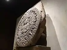 The Aztec sun stone (Spanish: Piedra del Sol) is a late post-classic Mexica sculpture housed in the National Anthropology Museum in Mexico City, and is perhaps the most famous work of Mexica sculpture.[1] It measures 358 centimetres (141 in) in diameter and 98 centimetres (39 in) thick, and weighs 24,590 kg (54,210 lb).[2] Shortly after the Spanish conquest, the monolithic sculpture was buried in the Zócalo, the main square of Mexico City. It was rediscovered on 17 December 1790 during repairs on the Mexico City Cathedral.[3] Following its rediscovery, the sun stone was mounted on an exterior wall of the cathedral, where it remained until 1885.[4] Early scholars initially thought that the stone was carved in the 1470s, though modern research suggests that it was carved some time between 1502 and 1521.[5]