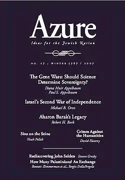 Azure: Ideas for the Jewish Nation (Hebrew: תכלת) (Tchelet) was a quarterly journal published by the Shalem Center in Jerusalem, Israel. Azure published new writing on issues relating to Jewish thought and identity, Zionism, and the State of Israel. It was published in both Hebrew and English, allowing for the exchange of ideas between Israelis and Jews worldwide.[1]