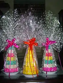 Bánh in (lit. 'seal cake') is a Vietnamese cake from the Huế area given at Tết, Lunar New Year. The cakes are often stamped with an auspicious Sino-Vietnamese character such as "tho" for long life.[1] The cake is now quite popular overseas as well and is commonly found all year round in Asian grocery shops worldwide, often in smaller rectangular shaped snack packs. The main ingredients are mung bean, rice flour and durian.